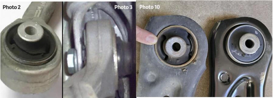 (Фотографії, на яких зображено типові пошкодження: тріснуті, порвані та зношені втулки важеля керування.)