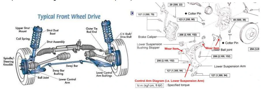 (Діаграми, що показують стандартне розміщення втулок важеля керування в системах підвіски.)