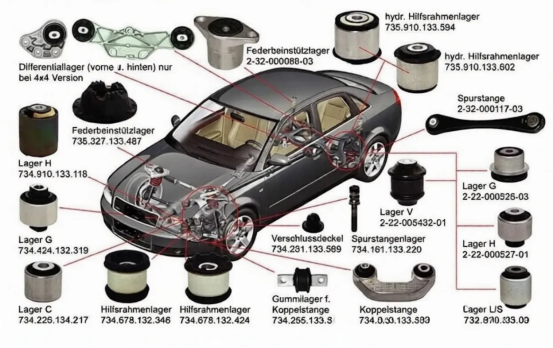 1. Система підвіски:У підвісці гумові втулки служать для з’єднання компонентів, поглинання ударів і підтримки точного вирівнювання, покращуючи як керованість автомобіля, так і комфорт їзди.