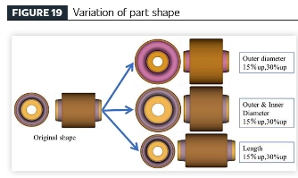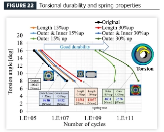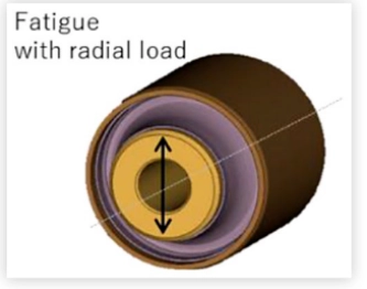 [Створення ефективного процесу розробки транспортного засобу за допомогою технології аналізу втоми] Застосовуючи запропонований метод аналізу втоми для віброізоляційних гумових компонентів, було проведено параметричне дослідження компонентів, виготовлених з того самого матеріалу, щоб дослідити взаємозв’язок між геометричними варіаціями (об’ємом гуми) та довговічністю. Геометрію компонентів було отримано з оригінального дизайну деталі з модельованими варіаціями, включаючи: