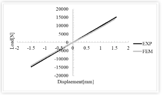 Крива жорсткості втулки (крива сили-переміщення) порівнюється з експериментальними результатами, що додатково підтверджує справедливість встановленої моделі FEM. Як видно з малюнка: аналіз із використанням гіперпружних параметрів, визначених із зразків для випробування матеріалу, демонструє хорошу узгодженість між експериментальними та аналітичними результатами на діаграмі навантаження-переміщення.